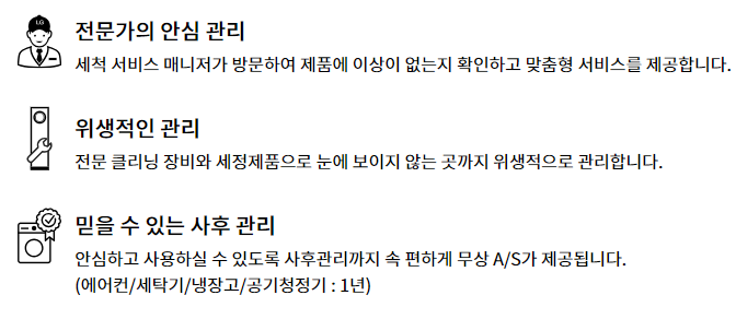 LG전자에서는 세척 서비스 매니저가 방문하여 에어컨을 분해하여 세척하는 서비스가 있으며 무상A/S가 1년까지 제공됩니다.