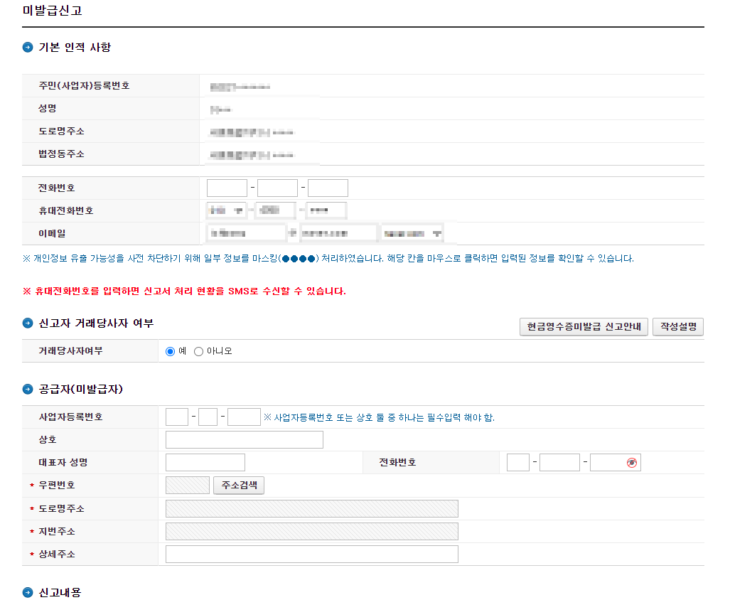4) 기본 인적사항, 공급자 및 신고내용등을 작성하여 제출합니다.