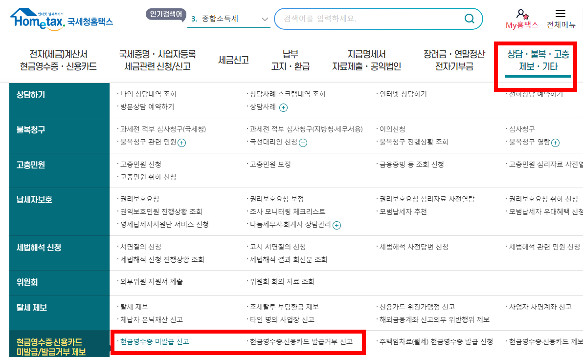 2) 메뉴중에서 상담.불복,고충.제보.기타를 선택하여 서브 메뉴중 현금영수증.신용카드.미발급/발급거부 제보를 선택합니다.