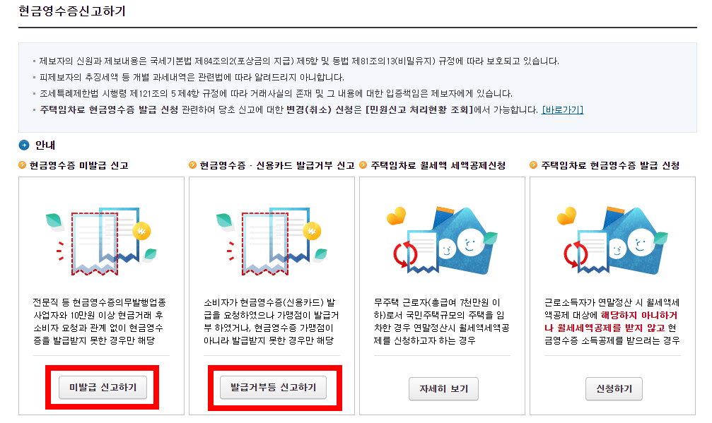 3) 현금영수증하기 메뉴에서 미발급 신고하기 또는 발급 거부 등 신고하기에서 해당하는 버튼을 선택합니다.
